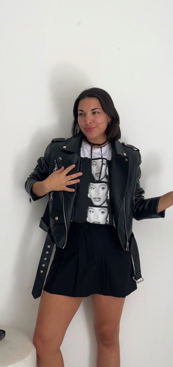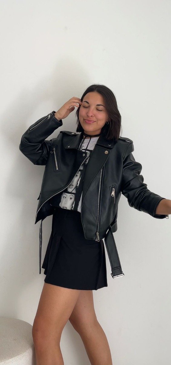 Campera de ecocuero estilo biker. Tiene cierre metálicos en las mangas y bolsillos.
