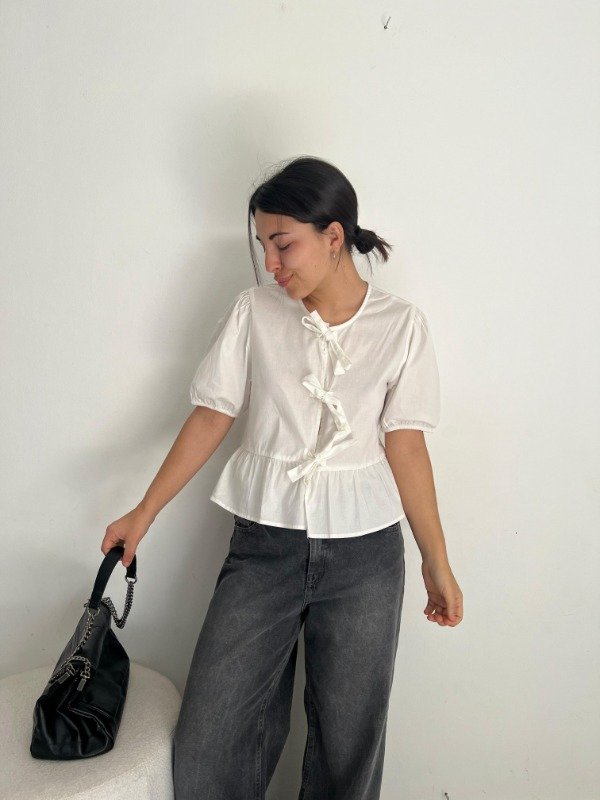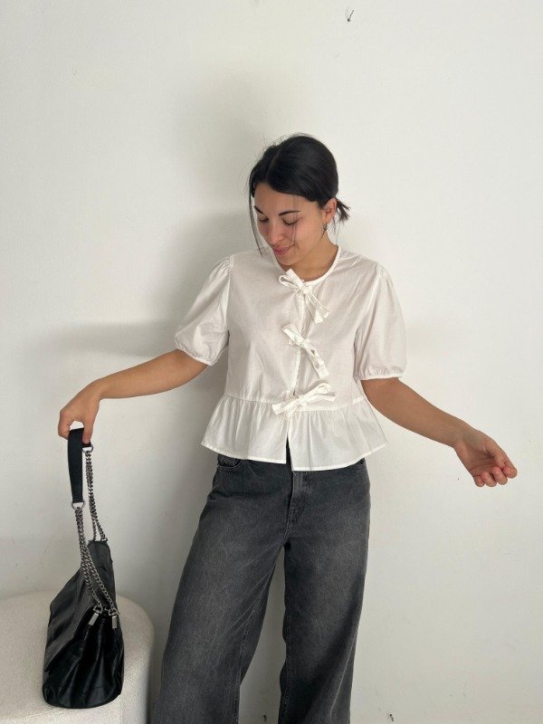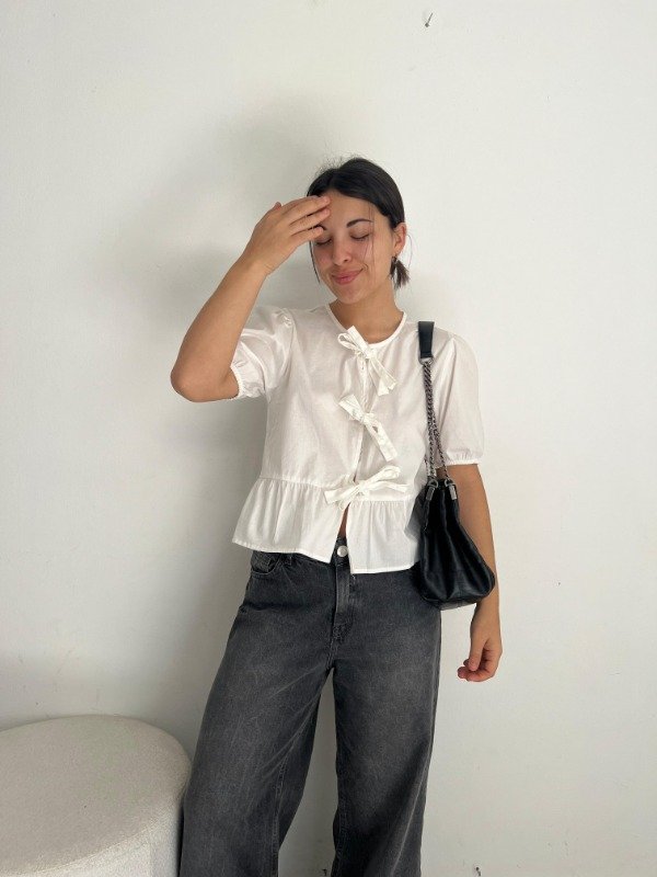 Blusa manga corta con detalle de volados y tiras para atar en el delantero.